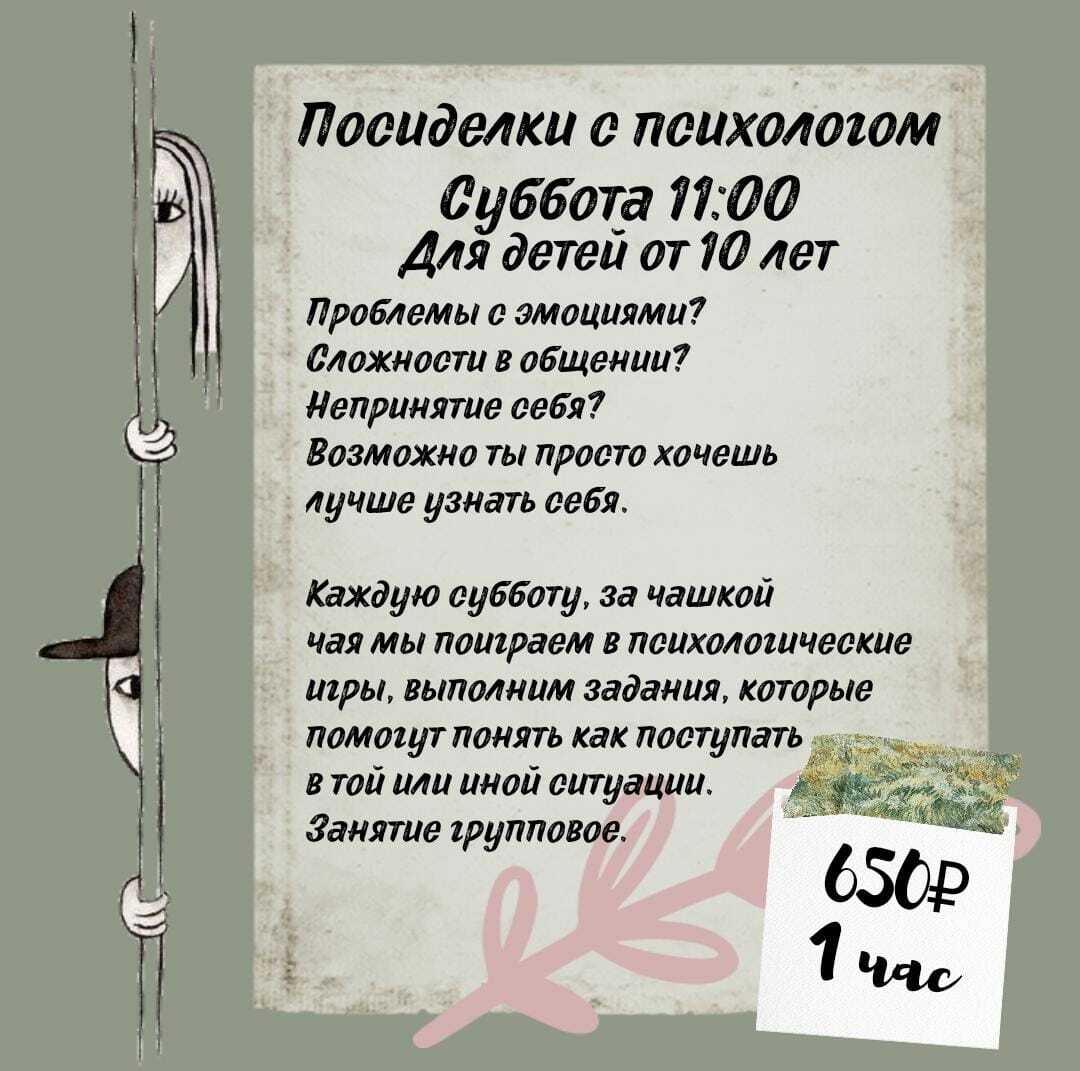 посиделки с психологом за чашечкой чая и вкусняшками и настольные игры . Чтоб детки могли поделиться своими проблемами и страхами а наш детский психолог Екатерина направит разговор в нужное русло . по субботам в 11:00